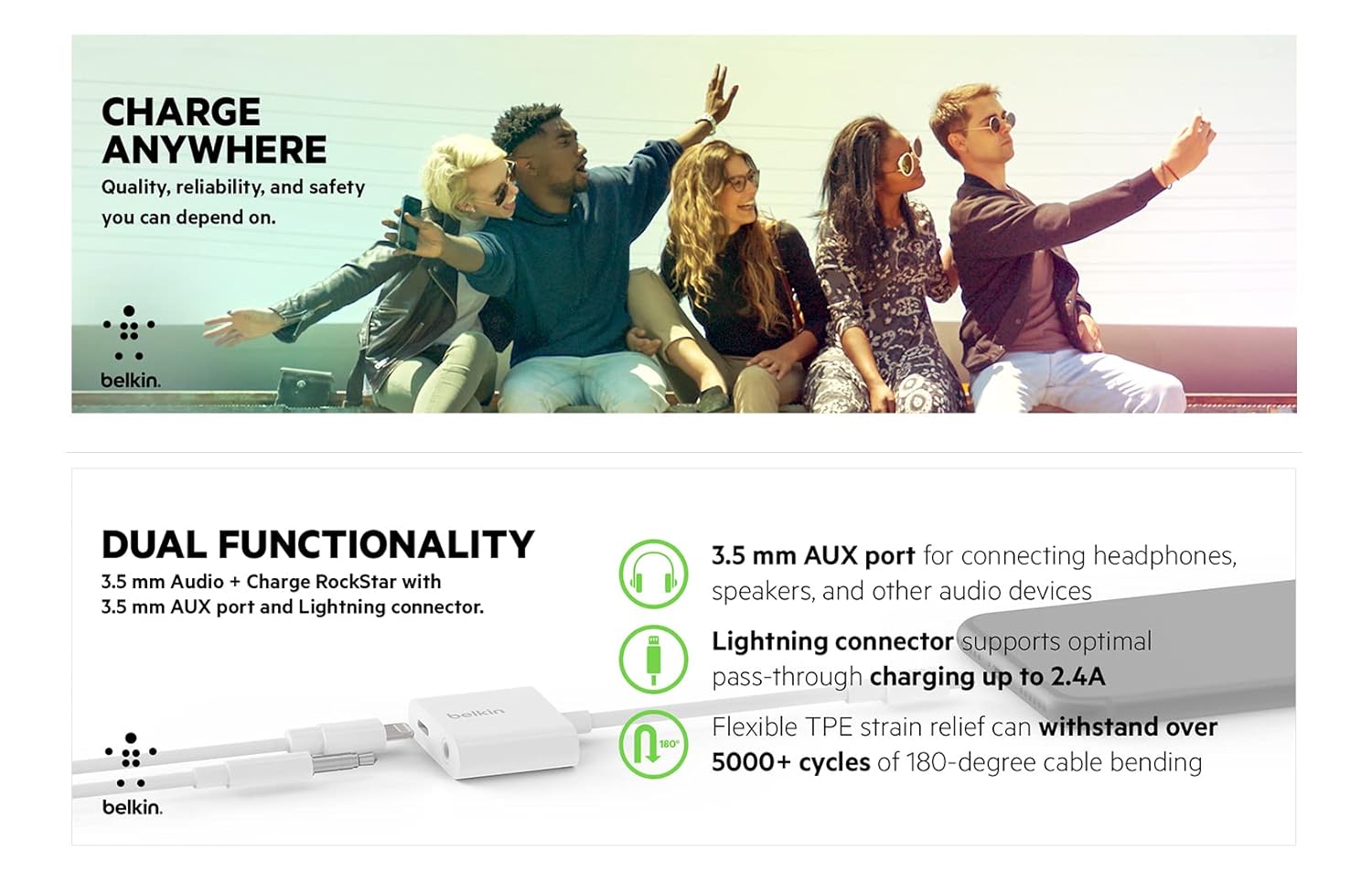 Audio Quality: The 3.5 mm Audio + Charge RockStar is certified to meet Apple specifications, and uniquely designed to ensure clear and crisp audio. Supports remote control and microphone from MFi-certified 3.5 mm headphones;Uncompromised Audio Quality: The 3.5 mm Audio + Charge RockStar is certified to meet Apple specifications, and uniquely designed to ensure clear and crisp audio. Supports remote control and microphone from MFi-certified 3.5 mm headphones