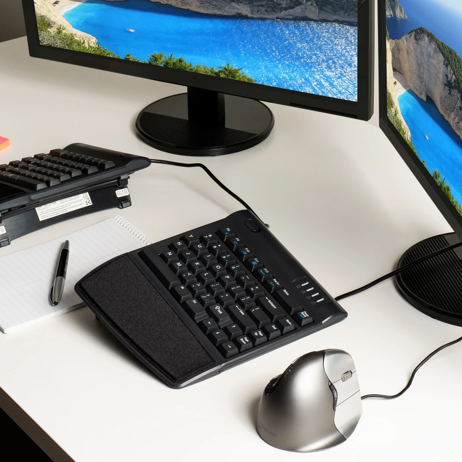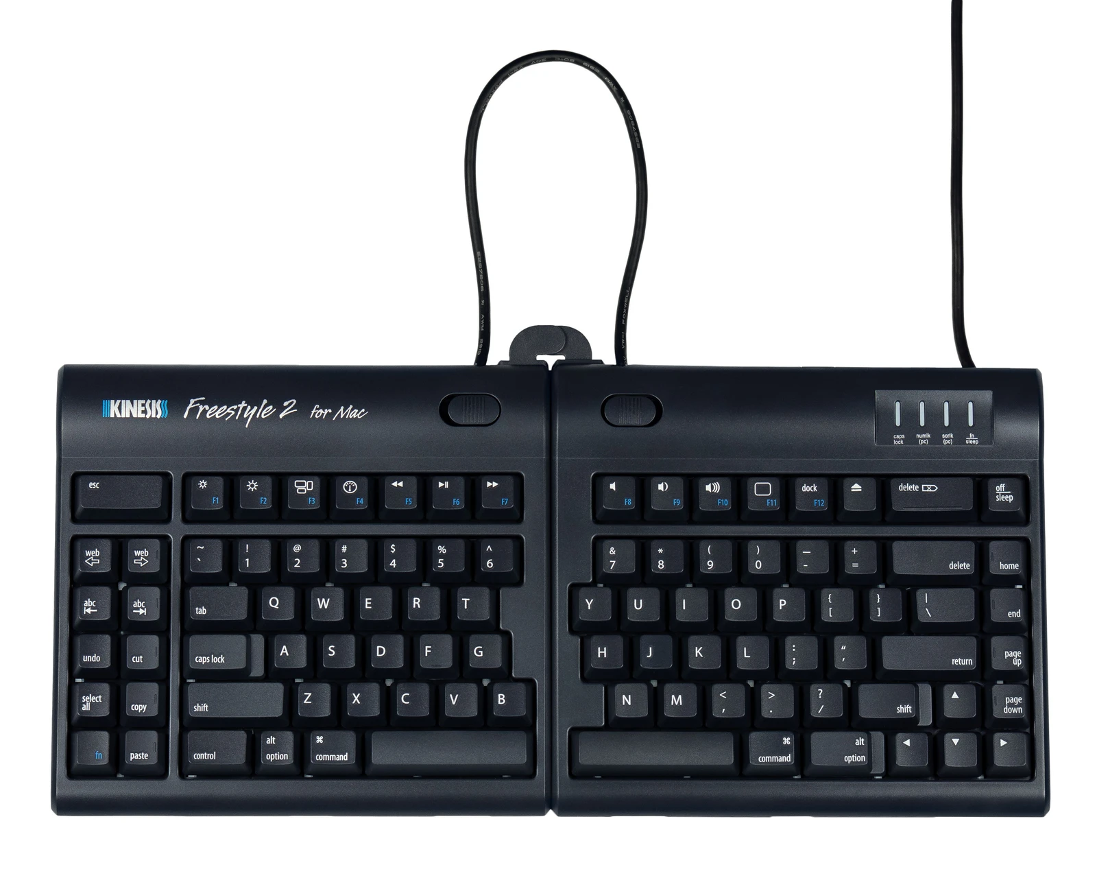 The Freestyle2 keyboard by US manufacturer Kinesis has a zero degree slope that minimizes the height and creates a negative slope, resulting in reduced wrist extension.