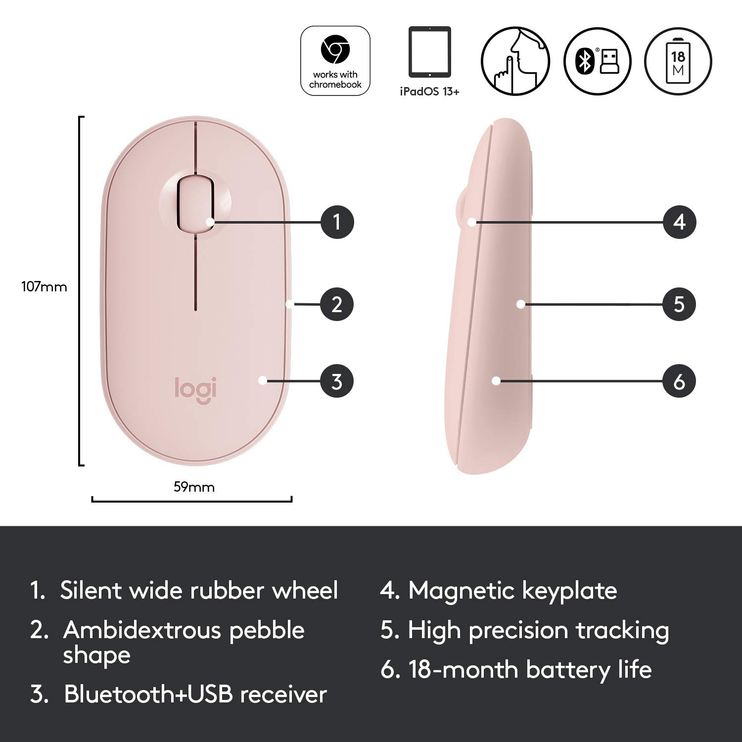 Logitech Pebble Wireless Mouse with Bluetooth or 2.4 GHz Receiver, Silent, Slim Computer Mouse with Quiet Clicks, for Laptop/Notebook/iPad/PC/Mac/Chromebook – Rose