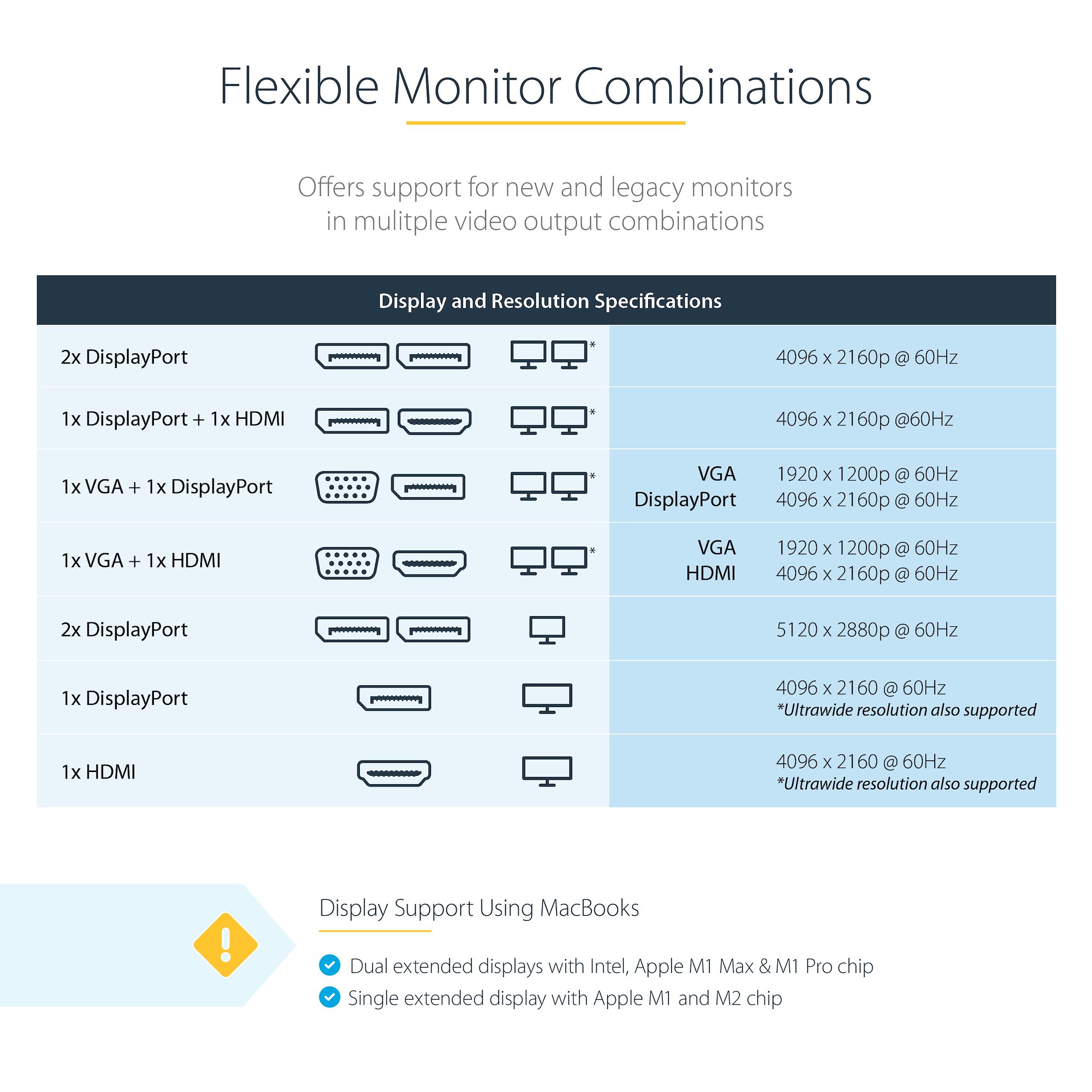 • FLEXIBLE MONITOR OUTPUTS: Connect up to two external monitors for up to dual 4K video with any combination of 2x DP (4K 60Hz), 1x HDMI (4K 60Hz) or VGA (1080p 60Hz); Video output utilizes direct GPU performance with no software or compression